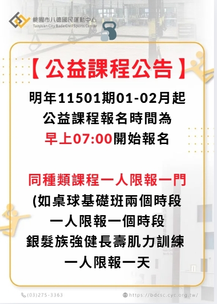 11501 期(1–2 月) 起, 公益課程的報名時間將調整為:早上 07:00 開始報名 為確保課程公平性,也請大家留意以下規則: 同種類課程一人限報一門 若課程有多個時段(例:桌球基礎班),一人只能選報其中一個時段 銀髮族強健長壽肌力訓練:一人限報一天 歡迎大家踴躍參加,提升健康、一起動起來!
